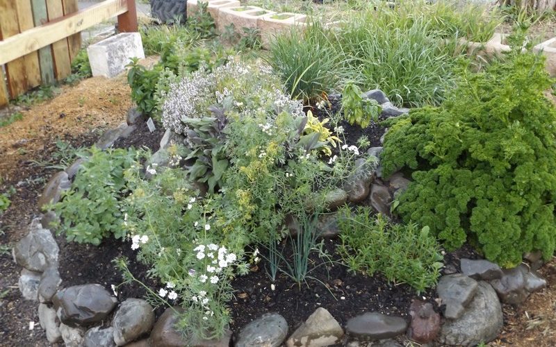 A herb spiral is a permaculture concept that puts all your culinary herbs at your fingertips.  The design of the spiral is such that it allows for a wide variety of herbs and growing conditions.  Heat loving dry herbs go at the top, whereas herbs that prefer shade and moisture go at the bottom.  (See our Herb page for a complete list of herbs and their preferred growing conditions)